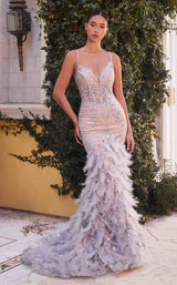 Do not get constrained indoors and flaunt this beautiful outfit by Andrea and Leo A1116. It has a plunging mesh neckline and an illusion bodice. The skinny shoulder straps complement the sleeveless design. The embellished contoured waistline follows a full-length skirt adorned with sequins and three-dimensional feathers. It ends with a feathery sweep train.