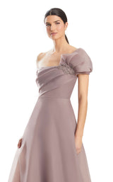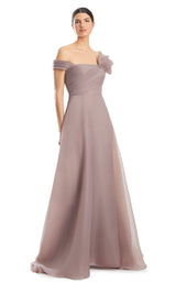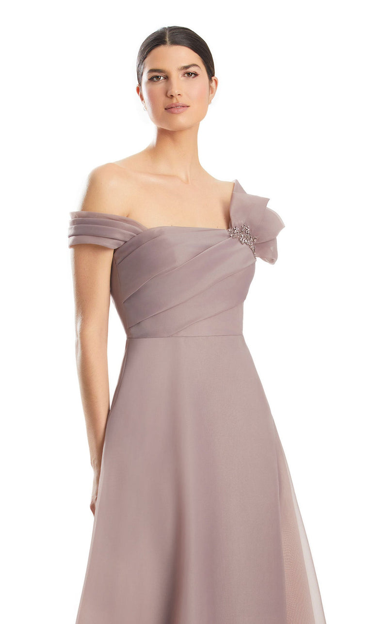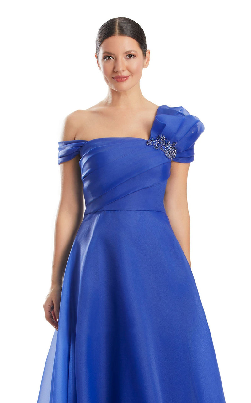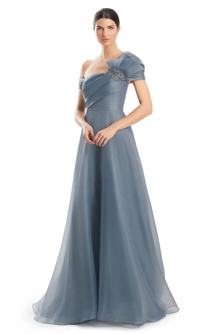 Fetch compliments all night in this solid-toned 1985S24 Daymor dress. Its asymmetrical neckline displays a half sleeve on one side and a dropped sleeve on the other. The pleated bodice flaunts soft pleats with bead adornments and overlapped fabric on the side. It effortlessly drops into an A-line skirt and ends with a court train. Pair this Daymor outfit with your favorite sandals and head out for a memorable evening.