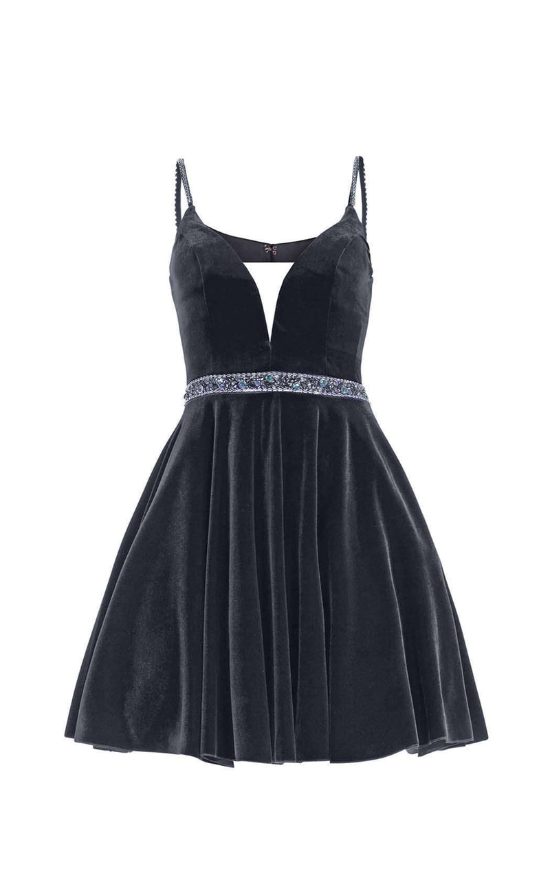 Show off your elegance in a detailed dress from Alyce 3712 Paris. The strappy design shows off a deep portrait neckline. Lush fabric forms the bodice to a beaded waistband about your middle. The babydoll skirt is shirred with a dramatic flare and a hemline right above your knees.