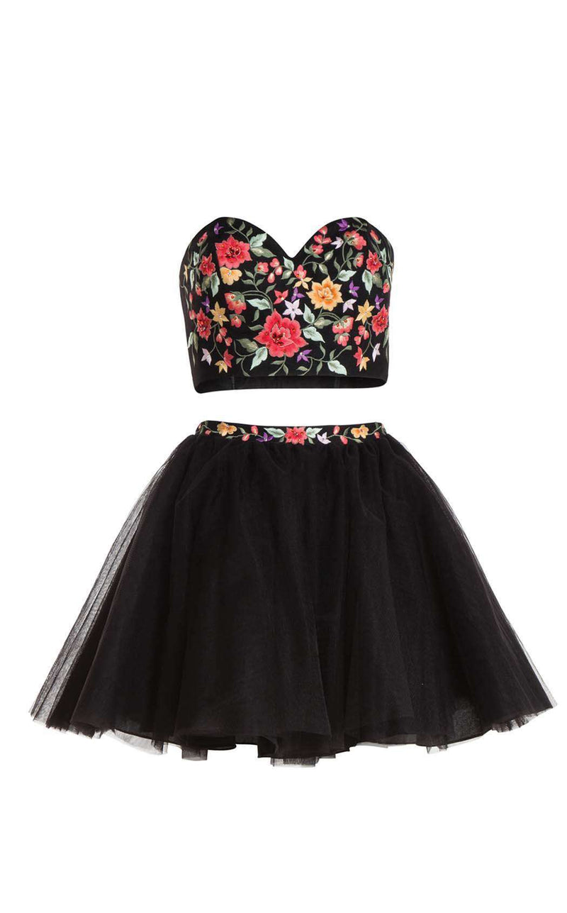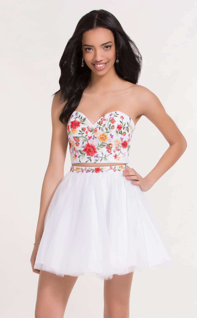 Every day is a celebration in a unique dress from Alyce 3740 Paris. A strapless sweetheart neckline starts out this stunning look. A multicolored floral motif blooms over the crop top bodice. A blossoming waistband cinches your middle. The babydoll skirt is layered ruched and flares at your hips.