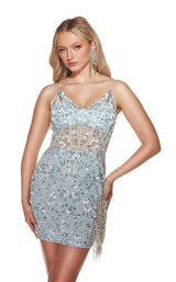 Embody majestic allure and aesthetic charm wearing the Alyce 4871 dress. A timeless V-neckline and dainty shoulder straps adorn this fitted silhouette. Featuring intricate beaded embroidery details throughout, this mini dress beautifully illuminates your presence. With a sheer bodice, a side mesh panel cascades to radiate the sparkling shine of rhinestone frills.