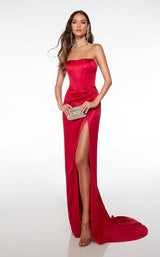 Show your prowess in this sophisticated 61489 Alyce gown. The boned corset has a strapless straight neckline and a midrise zipper back. It continues with a basque waistline and erupts in a high-slit sheath skirt. Elegantly displaying your toned legs and giving room for uninterrupted drama, the slit ends with a sweeping train.