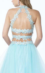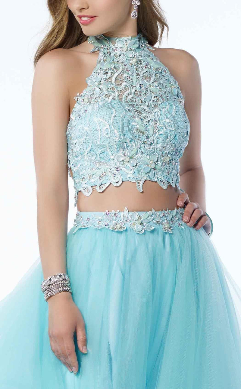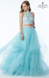 Two-piece A-line gown with halter neck and strappy open back from Alyce ParisDress in this fabulous two-piece dress designed by Alyce Paris for your upcoming evening party. The crop top has a fitted bodice with intricately embellished floral appliques and high halter neckline that leads to a strappy open back. The A-line silhouette skirt flares from the floral appliqued waist in layers and ruffles to end with a slight sweeping train.