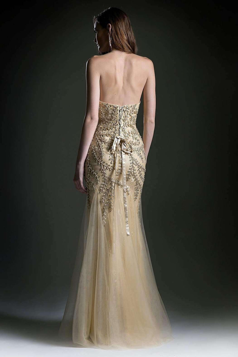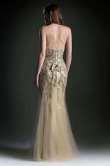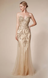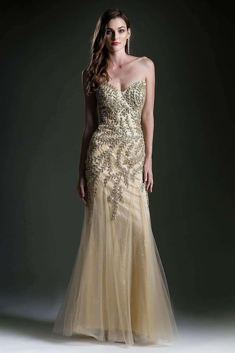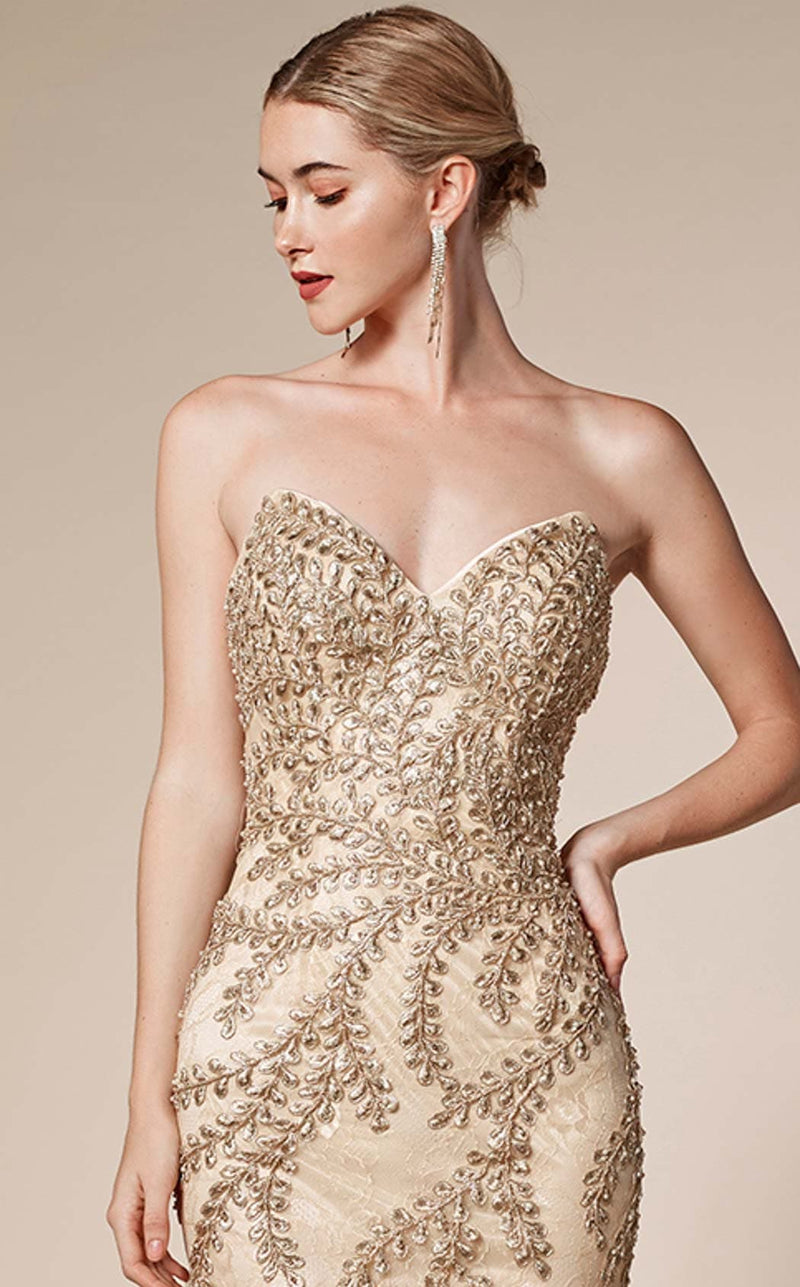 Look impeccable in this beautiful golden column gown by Andrea and Leo. The strapless sweetheart neckline has a unique exaggerated point and is embellished with amazing metallic embroidered vines. The vines continue to wind down the torso revealing lace fabric on the skirt. Godets create a gentle flare at the knee.