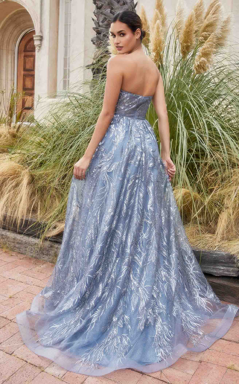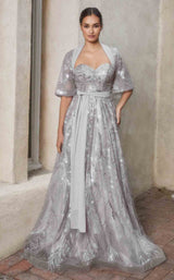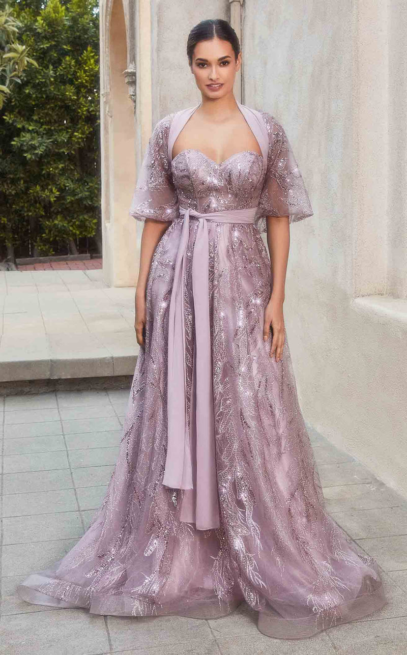 Pull off this breathtaking attire from the house of Andrea and Leo A1174 and steal the limelight. Graced with a Queen Anne neckline and elbow-length flared sleeves, this captivating dress is showered with glistening beaded embellishments throughout its length. The waist has a removable self-belt while the A-line skirt drapes to the ground and finishes off with a sweep train.