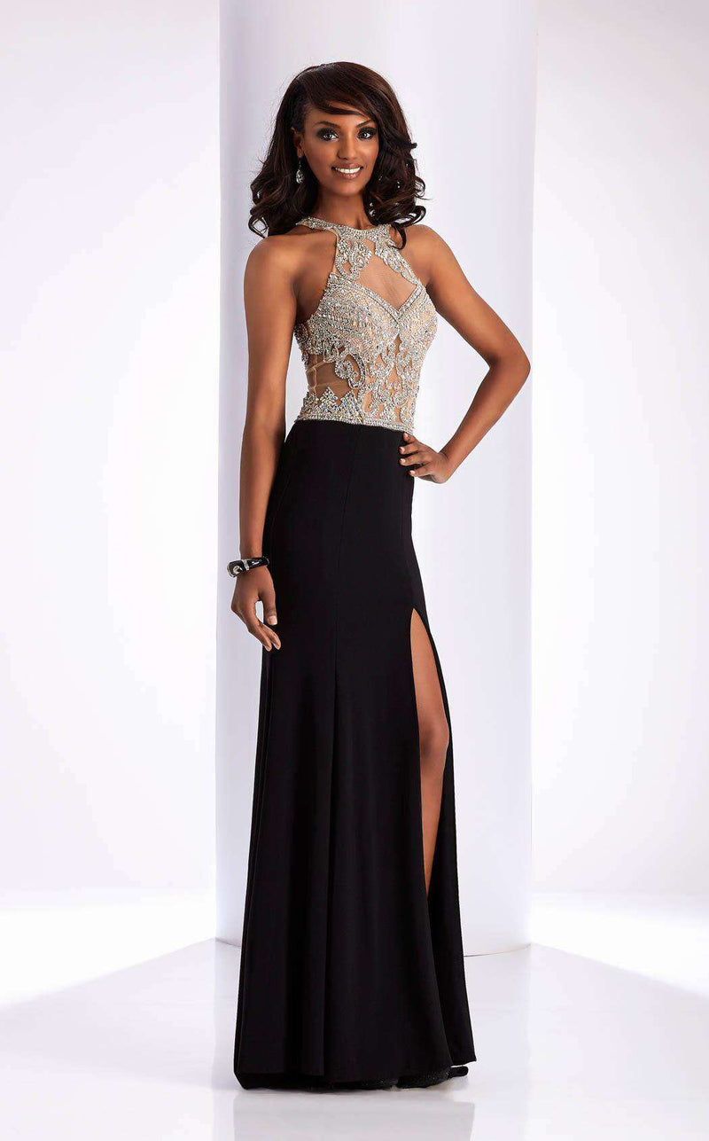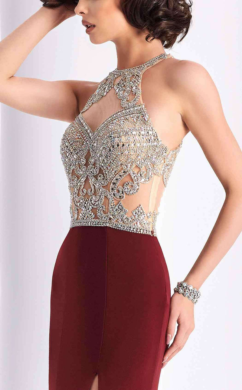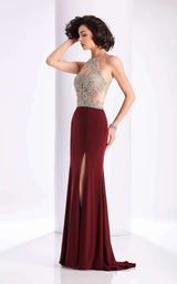 Look ready to walk the red carpet in this evening gown from Clarisse 3184. This sleeveless dress has fine jeweled accents throughout the fitted bodice. The skirt is smooth with soft movement with a slit at one side. This gown is full length.