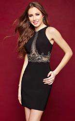 All eyes will be watching you in this tantalizing cocktail dress by Clarisse 3338. The sleeveless bodice has a chic halter neckline and features sheer cutout details embellished with elegant diamond and scrolling details. Made to create curves, this body conscious ensemble will hug your shape to the mid-thigh hem for a dazzling and divine night out style.