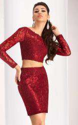 Look amazing in this fresh cocktail dress from Clarisse S3128. The illusion bateau neckline bodice has long slim sleeves and is wrapped in shimmering lace to the sassy cropped waist. Bare at the midriff, this fashionable two-piece ensemble will flaunt your curves in more rich lace to the mid-thigh hem for a versatile and sleek night out style.