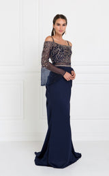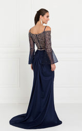 Look attractive and flaunt your fashion sense with this mermaid dress designed by Elizabeth K GL1500. The tail length dress features a straight across neckline with spaghetti straps and off shoulder bell sleeves. The beads, jewel, and sequin embellishments add glamour and highlight the fitted bodice. The mock two-piece dress has a beaded waistline belt that marks the beginning of a plain flare-style skirt.