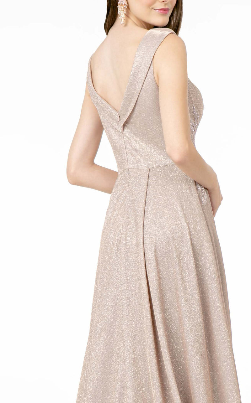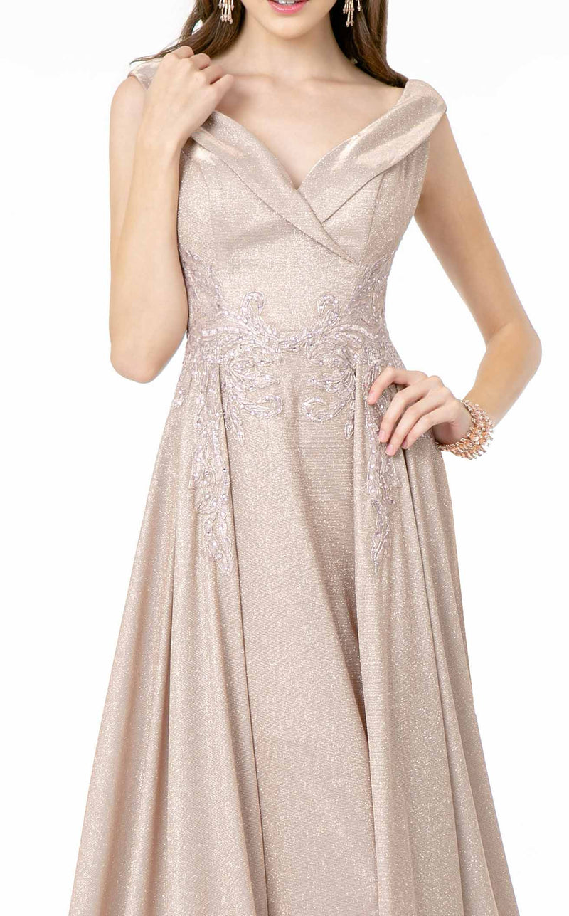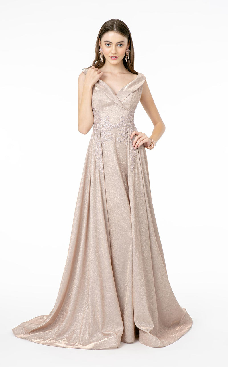 Add grace to your walk at the upcoming party with this fabulous long dress from the feminine collection of Elizabeth K GL1817. This fit and flare A-line dress beautifully flares to reach the ground and take the shape of a small chapel train. Sequined with gleaming embellishments, this dress gets a striking appeal from the fold-over accent adorning the V-neckline.