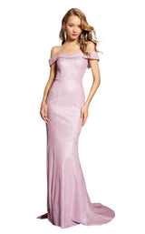 Turn into a timeless beauty in this sparkle long dress by Elizabeth K GL2562. The off-shoulder neckline with cap sleeves and flapped zipper back creates an attractive look while the sheer side panels add a bit of drama. This dress has glitter charms running across the mermaid silhouette and ends with a sweep train.