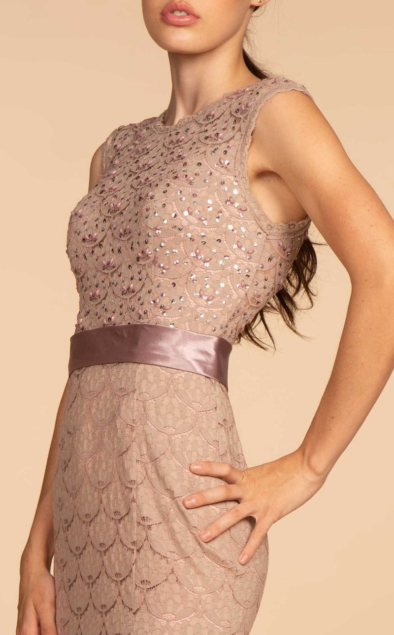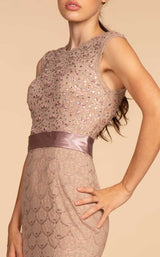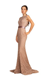 Look phenomenal in this long dress designed by Elizabeth K GL2613. Featuring a lacework throughout the trumpet silhouette with bead embellishments on the bodice, this dress is a stunner. It has a jewel neck and closed back, but the spotlight falls on the belted waist. The full-length hem of this dress ends in a sweep train.