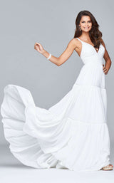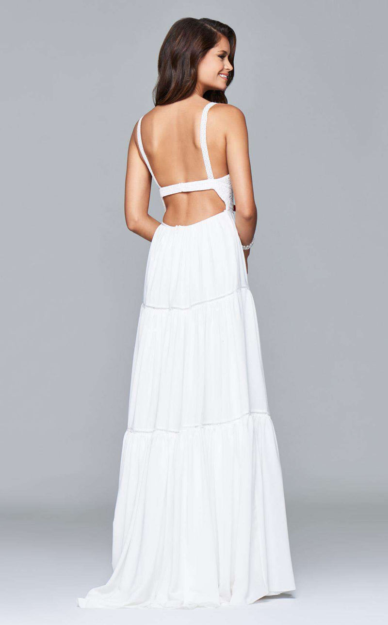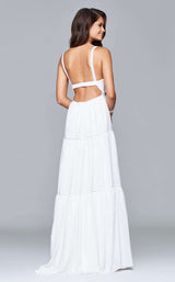 Show off your free style in this attractive bohemian gown by Faviana S7933. With a sultry plunging neck line and free flowing skirt, you`ll find yourself embracing both your sexy and your spirited sides. A flattering fitted waist line and spaghetti straps complete the top, and lovely soft pleats fall gently into the skirt of this fantastic design.