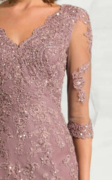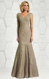 Ornate embellishments and lacy designs create delicate decoration over this exquisite gown by Feriani 18633. A V neckline frames the beginning of this lovely gown, with sheer three quarter length sleeves and a mermaid skirt adding in some elegant character to the look.