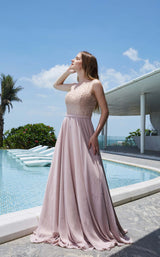 Sophisticated and impossibly chic, this mesmerizing long dress from Jadore J20004 is sure to capture some adoring glances. The dress reveals an illusion neckline that sits atop the sleeveless bodice, further enriched with eye-catchy bead embellishments. Wrapped around the natural waistline with a thin band, the dress turns into a fabulous A-line skirt that pleats and flows up to the floor-length curled hemline.