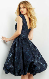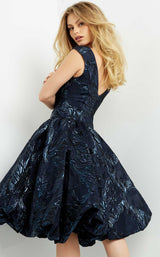 Style this brocade homecoming dress designed by Jovani for a spectacular night. Featuring a side-ruched bodice with a bateau neckline and low V-cut back, the dress would gather you many compliments. The midi dress has a bubble pleated skirt and empire waistline to give a tempting look on your special day. Its cap sleeves give you the perfect opportunity to glam up with a bracelet of your choice. To complement this beautiful dress, you can wear a pair of stilettos.
