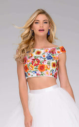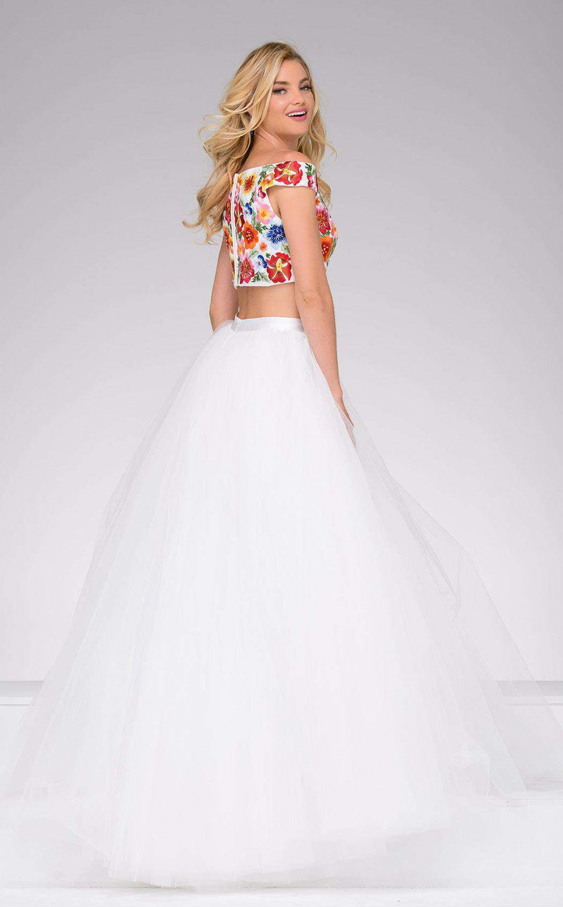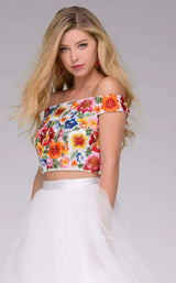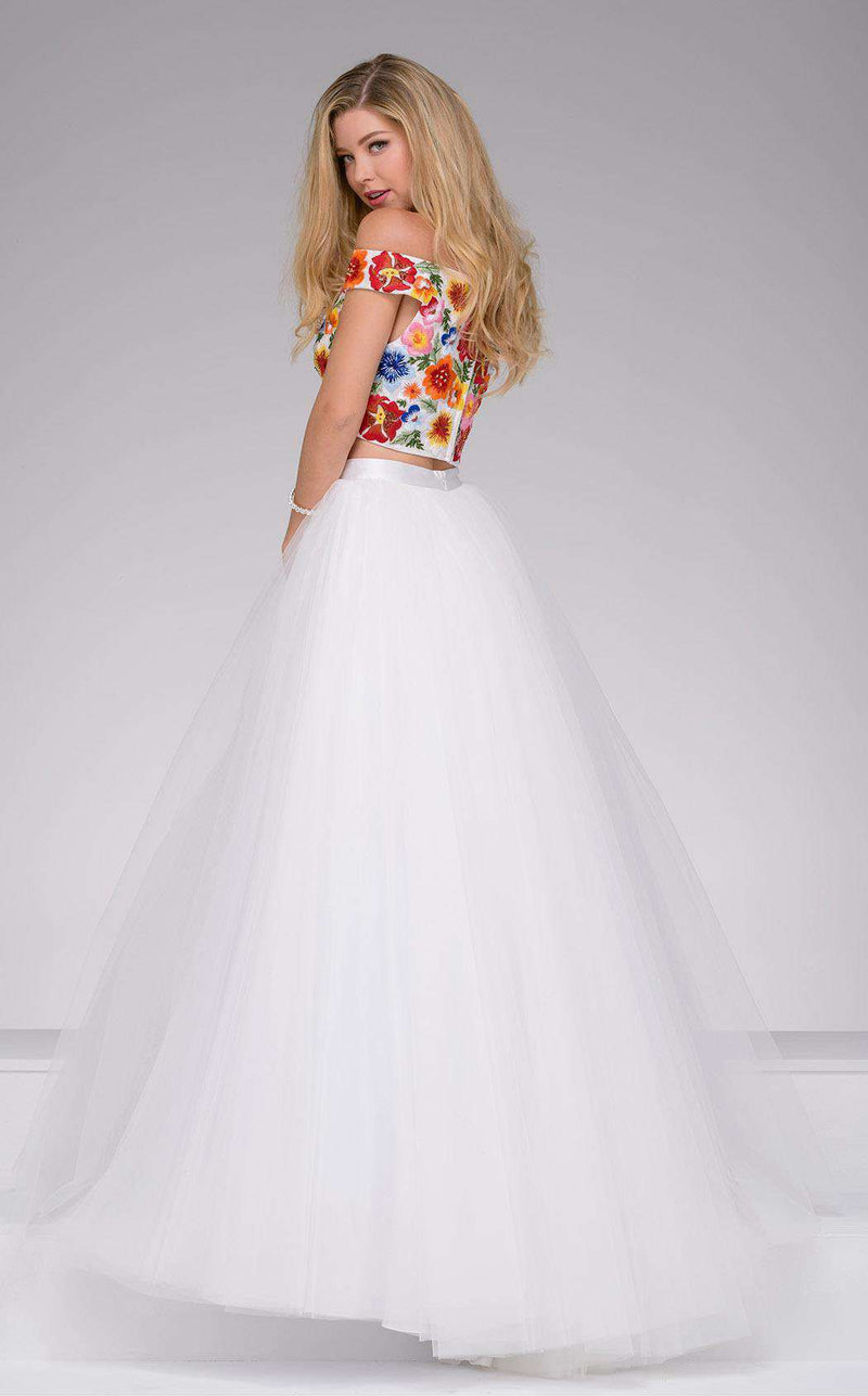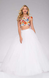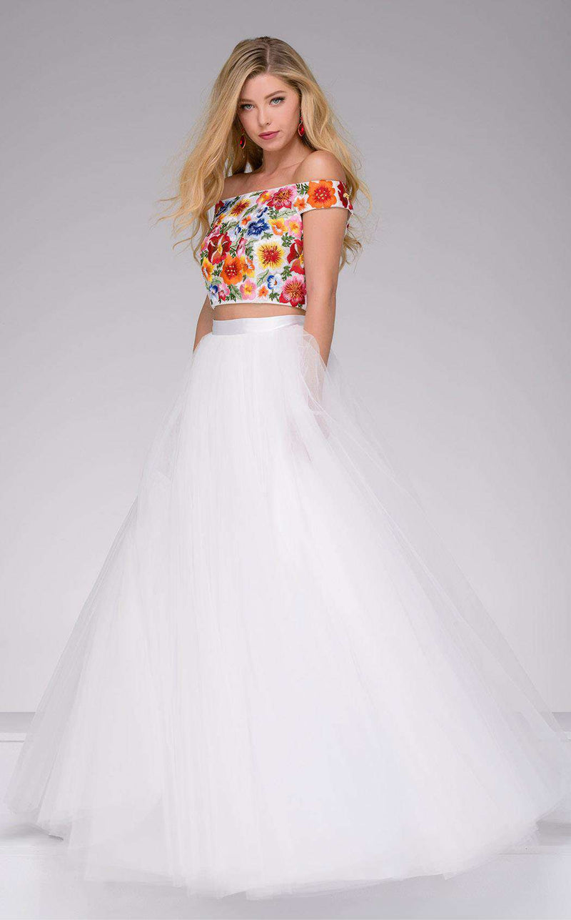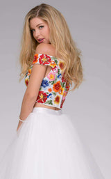 Prepare for compliments in a posh gown from Jovani. A bateau neckline highlights the cap sleeve style. Flowery embroidery beautifies the crop top bodice. A sewn-in waistband circles your waist. Layers of sheer and solid fabric create a voluminous ballgown skirt with shirring down to the floor.