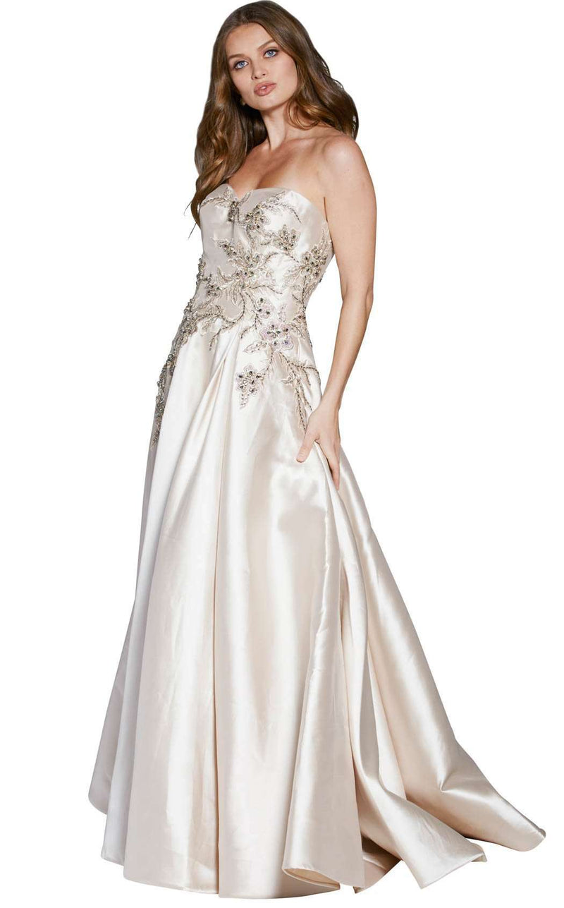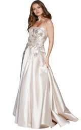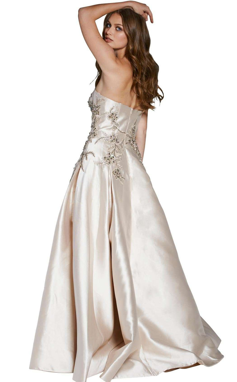 Elite strapless evening gown with upscale accents by Jovani