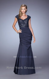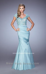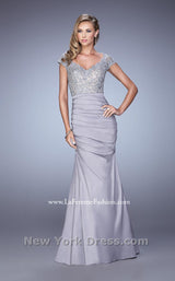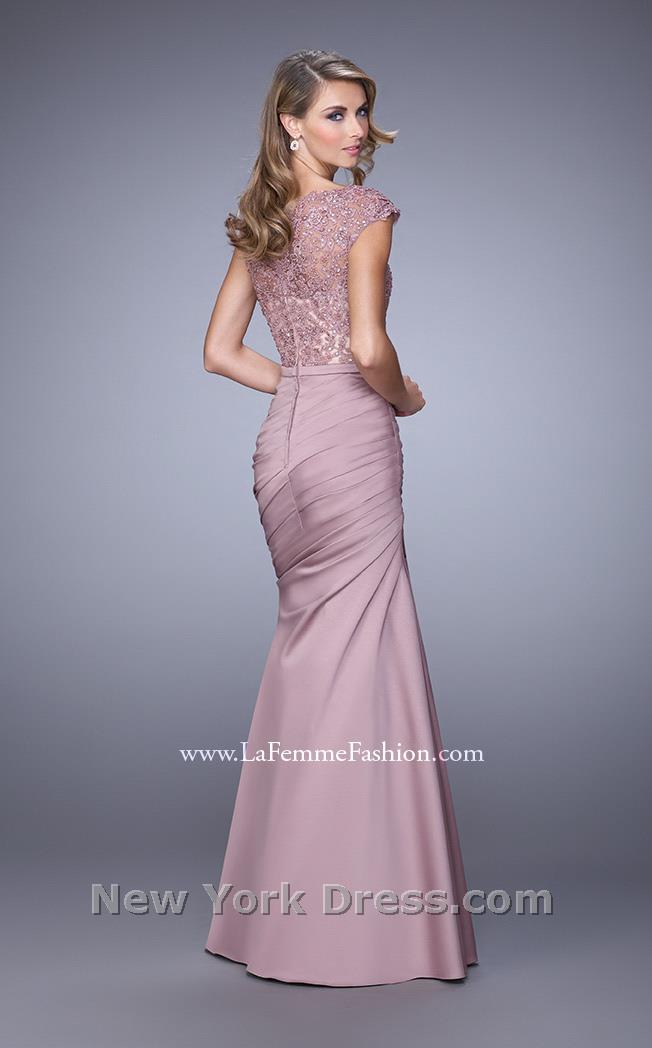 Work a room wearing this stunning evening gown by La Femme 21669 Evening. This dress has cap sleeves and a scoop neckline. Ornate lace covers the bodice for rich texture. A tonal band winds around the waist and the column skirt boasts ruching for a gorgeous draped effect. This dress has a full length hem.