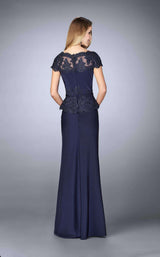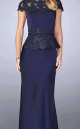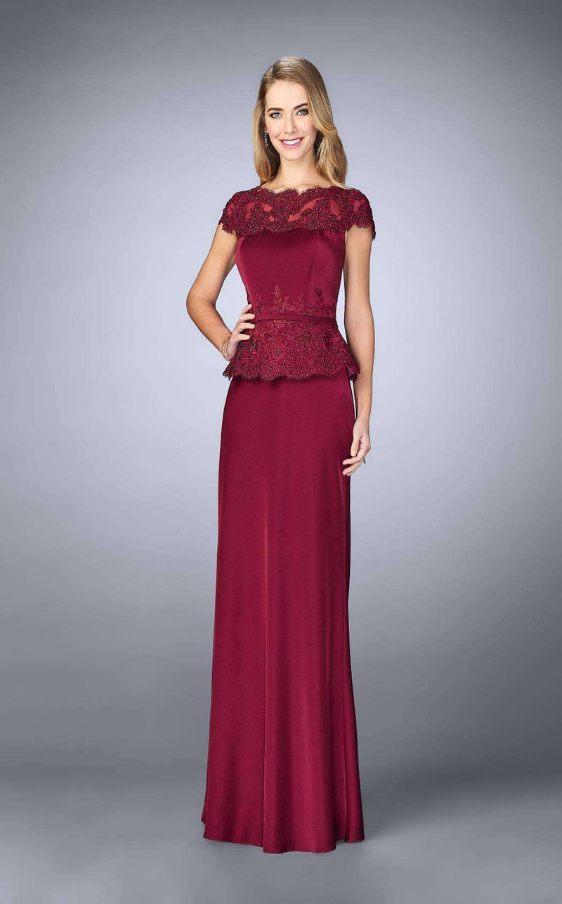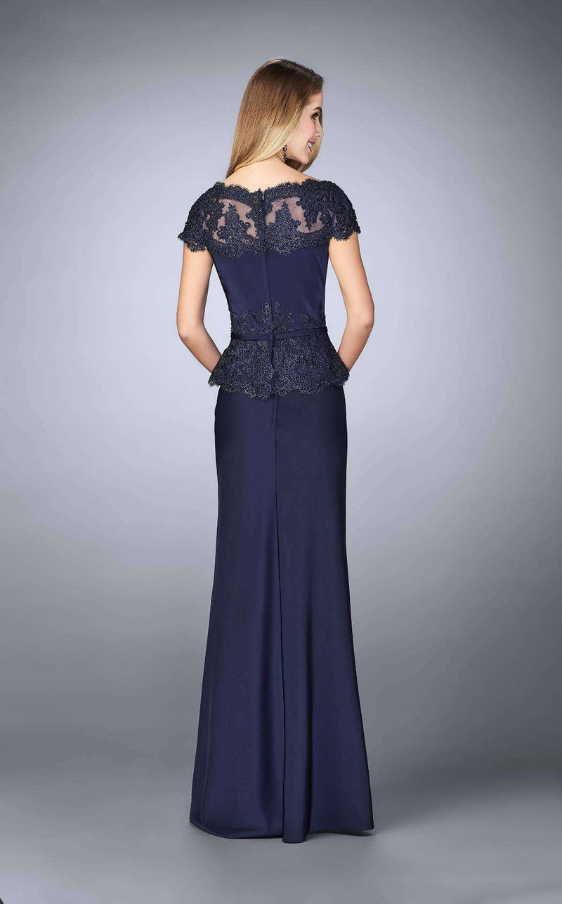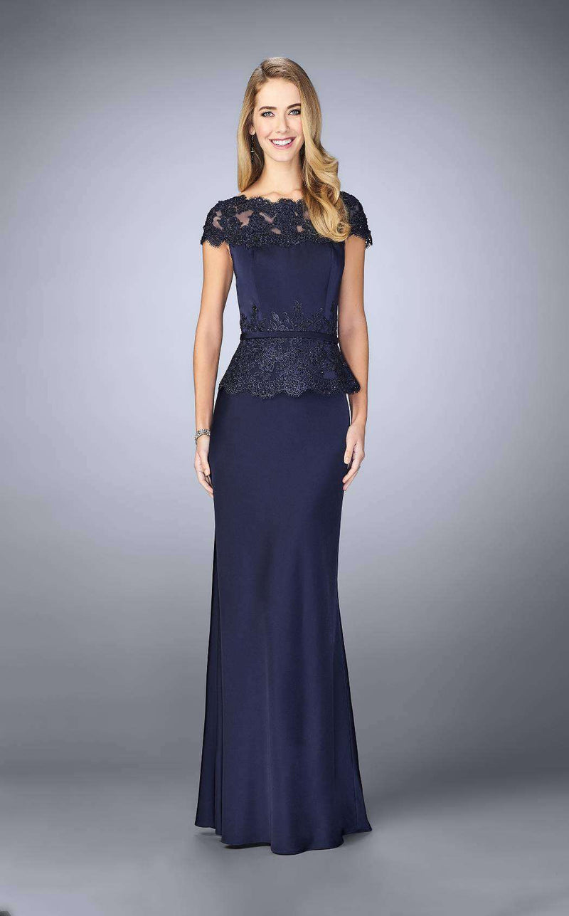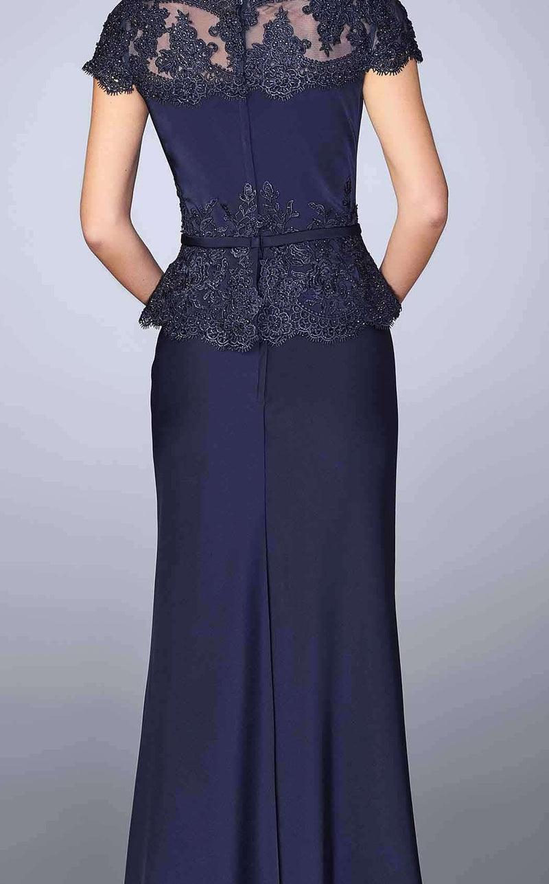 Feel ready for your close-up in this La Femme 23444 Evening gown. This dress has cap sleeves with rich applique detail throughout the upper portion. The bodice is fitted with a tonal ribbon at the waist and peplum detail. Fine applique accents the peplum. The skirt is smooth with a column silhouette and finishes with a full length hem.