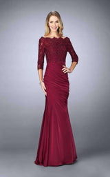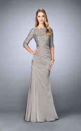 Look gorgeous for your next formal occasion in this La Femme 24926 Evening gown. This dress has quarter-length sleeves and a scalloped jewel neckline. Fine sparkling beadwork accents the fitted bodice. This dress has a ruched skirt that gathers at one side and finishes with a full length hem. It’s a fabulous gown meant to turn heads.
