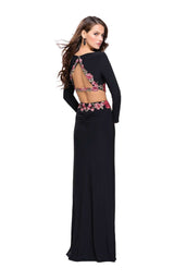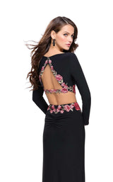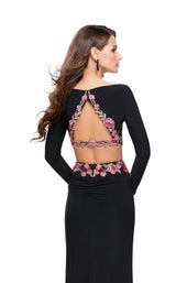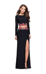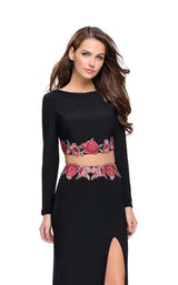 This blossoming formal set by La Femme 25695 puts a bloom on your special evening. Long, slim sleeves frame a scoop neckline while princess seams trace a curve-friendly fit. Colorful rose-blossom appliques detail the cropped midriff and garland the waist of the matching skirt. Svelte lines sluice along the hips, and a sensuous split accents the subtly flared full-length.
