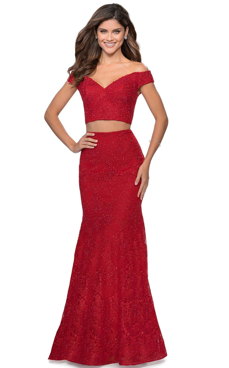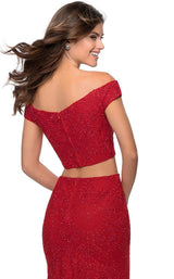 Orchestrate a spectacular evening of dazzling sophistication in this luxurious La Femme 28816 dress. The two-piece is designed with a fitted crop top that has an off-the-shoulder neckline and cap sleeves that lead to a zippered back. The long, glittering skirt flares down to the floor-length hemline in a trumpet silhouette that ends with a sweep train.