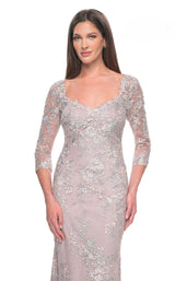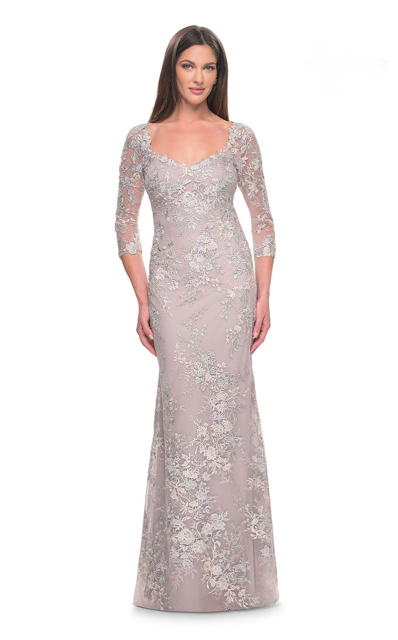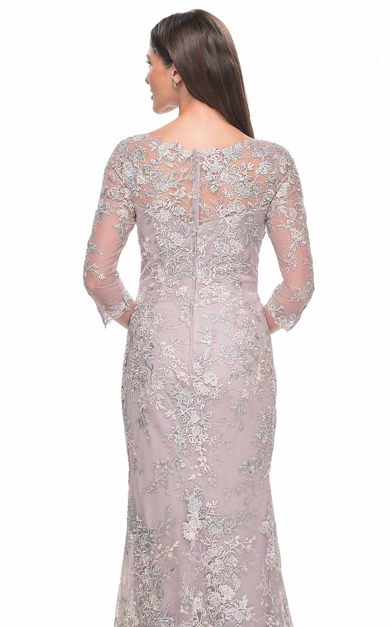 Leave a trail of admirers in this urbane 31804 La Femme long dress. The fitted bodice has a V-neckline, sheer quarter sleeves, and a closed zipper back. Slowly cascading in a trumpet silhouette, this outfit hugs your curves at the right places. It is enveloped in floral embroidery which exhibits gracefulness. This dress ends with a full-length hemline and pairs perfectly with stilettos.
