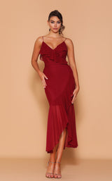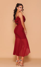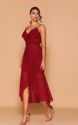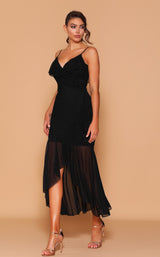 This Les Demoiselle classic makes you stand out from the crowd. This lovely midi dress has a fitted bodice with V-neck, spaghetti straps, and front and back ruched details. The semi-sheer skirt has an asymmetric wrap style with ruffle detailing and a high/low hem. In this graceful dress, you’d look effortlessly fabulous.