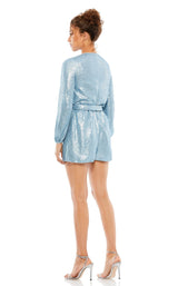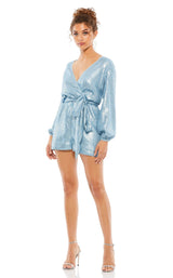 Channel your inner Rockstar in this embellished dress by Mac Duggal. The sparkly stones allow you to shine all night long. The bishop sleeved romper reveals a V-neckline in a wrapped bodice allowing knotted details on the waist giving you a relaxed fit. The natural waist allows mid-thigh shorts in loose fit and allows you to walk freely and to flaunt your legs.
