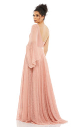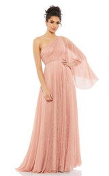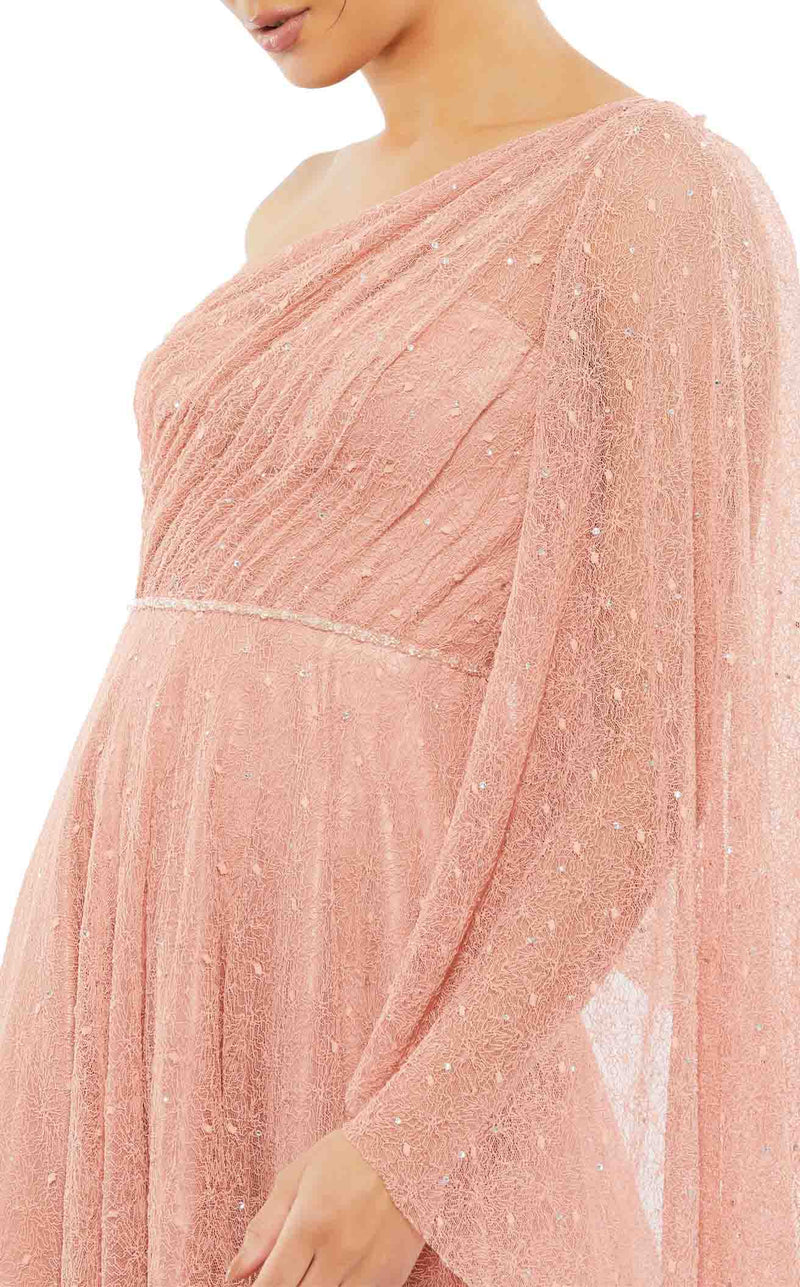This maxi dress by Mac Duggal 11244 is a sweet look with one shoulder and a kimono open sleeve on one side. The sleeves are open and see-through, with a shiny belt on the waistline. The straight skirt has pleats to give the dress a full look