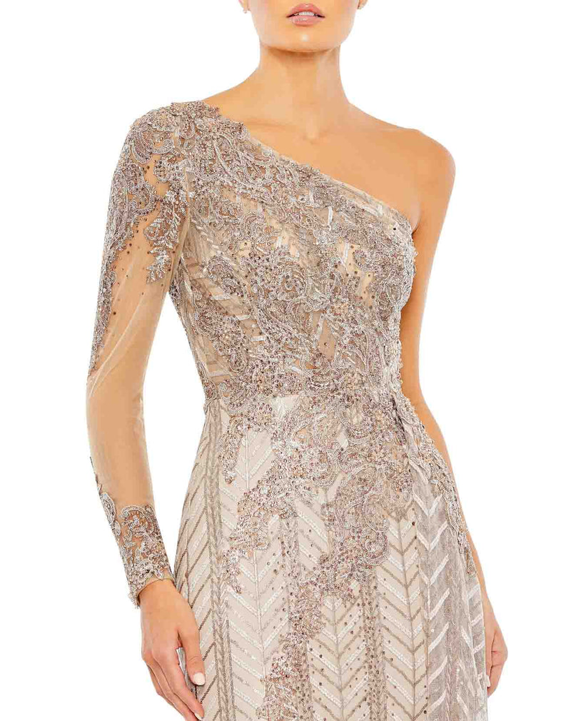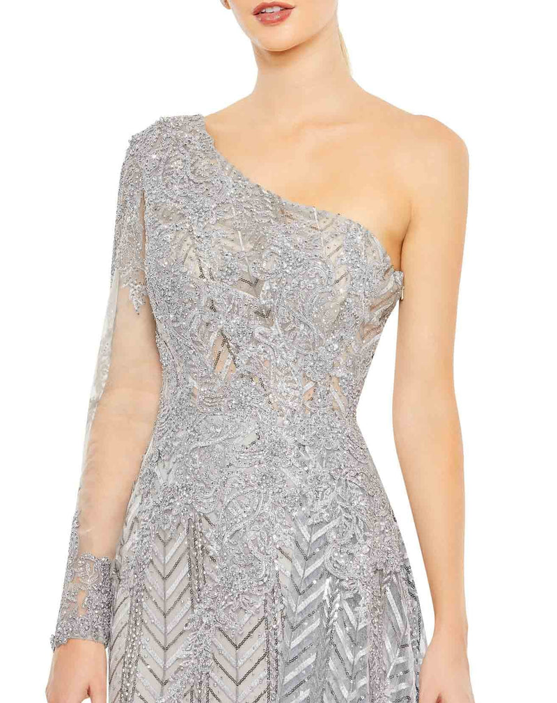 Asymmetrical Neckline One Side Full Sleeve Lace Embroidered Fit &amp Flare Dress by Mac Duggal
