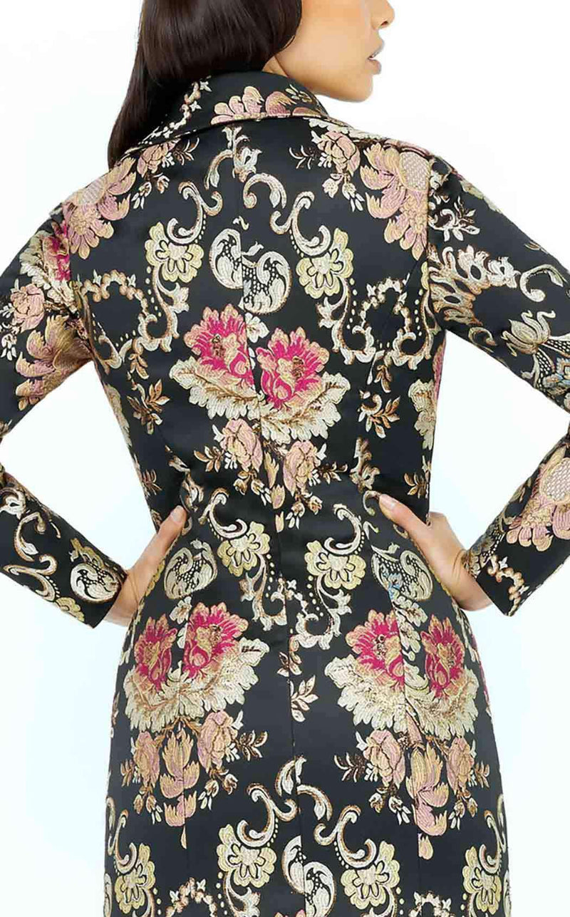 Update your look in a contemporary dress from Ieena for Mac Duggal 25434. A decorative floral print blooms down the length with long sleeves and a V-neck neckline. The ornamental style dances down the cocktail style with a pencil skirt and a hemline above your knees. Make your mark in this exciting dress.