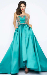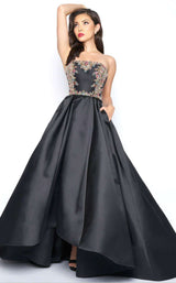 You`ll fall promptly in love with the majestic, one-of-a-kind style of this Mac Duggal 62590 gown! This strapless little number features a figure-flattering A-line silhouette. The flared floor-length skirt is bolstered by chic pickups. Up top, the body-conscious bodice features intricate beaded patterns and culminates in a straight neckline.