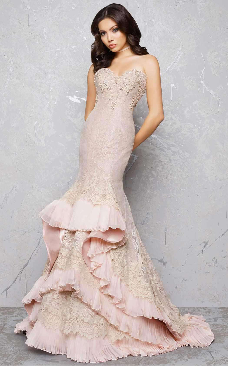 Wow the crowd in this Mac Duggal 80686 Couture evening gown. Strapless, this dress has a distinct sweetheart shape with tonal beading throughout the fitted bodice. The skirt has a soft mermaid silhouette with lace overlay throughout. The skirt has a dramatic mermaid silhouette with ruffled trim and finishes with a full length hem.