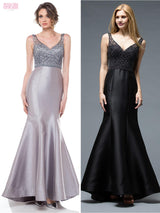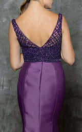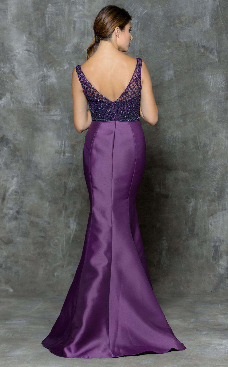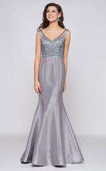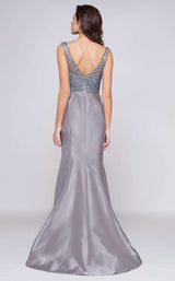 A V neckline borders a decoratively lined bodice on this classy gown by Marsoni M178. At the natural waistline, the style moves into the smooth sheen of a floor length mermaid skirt.