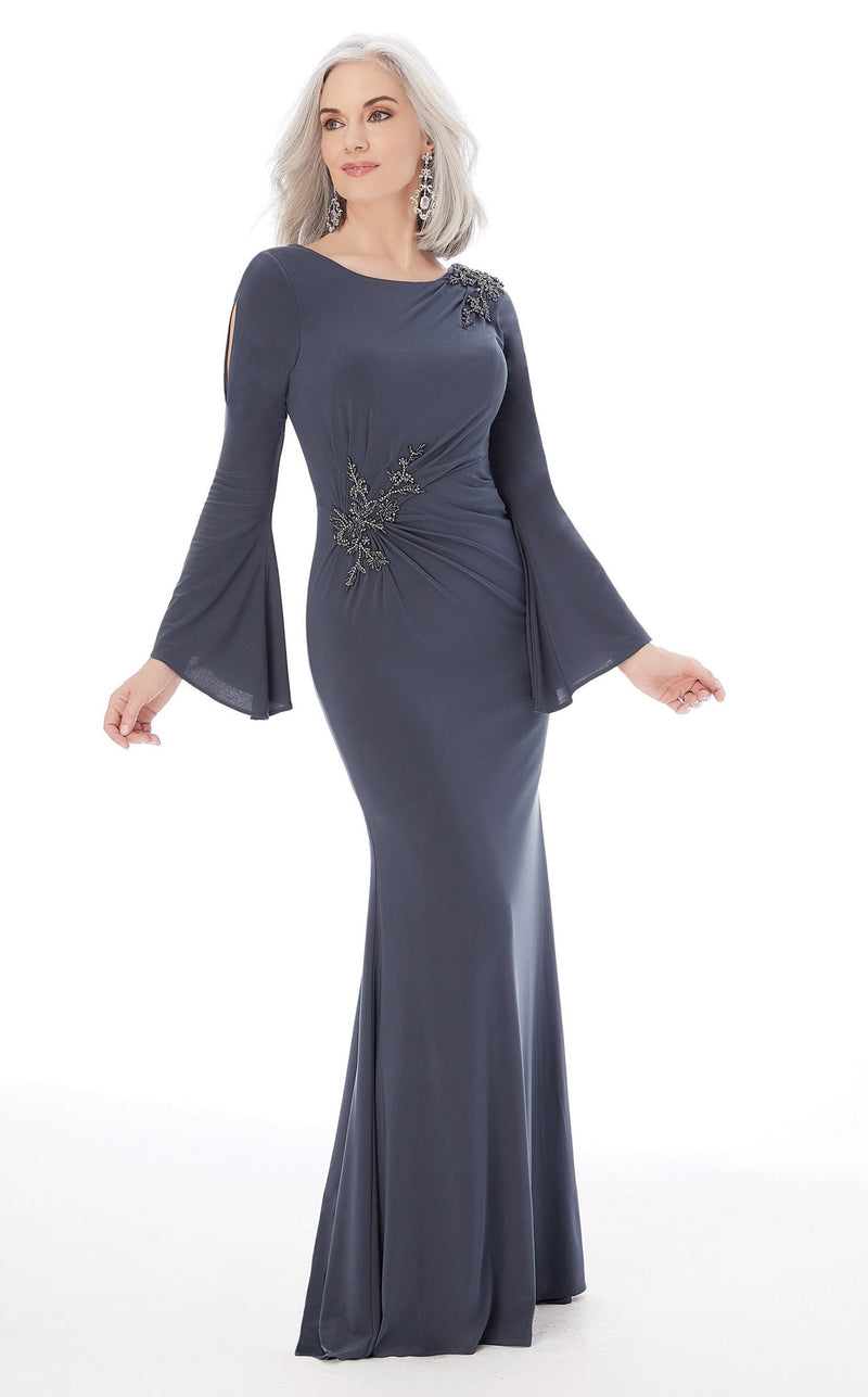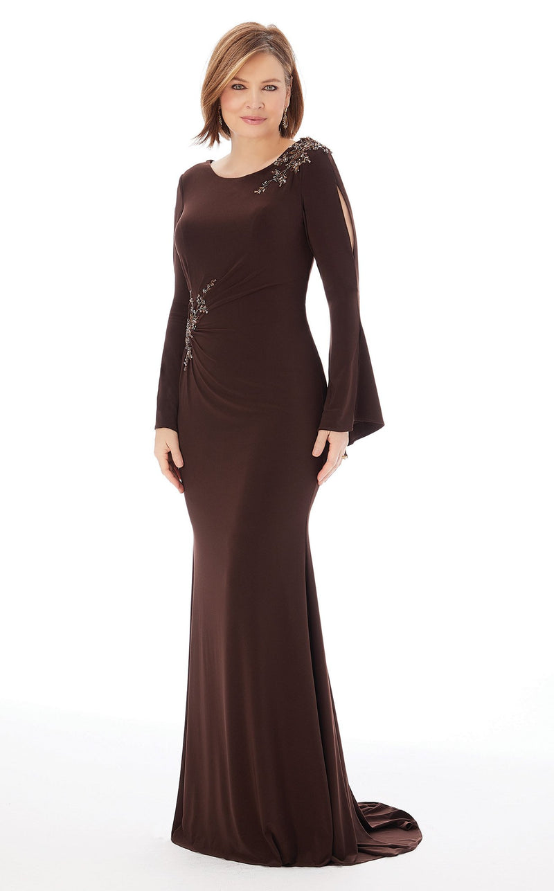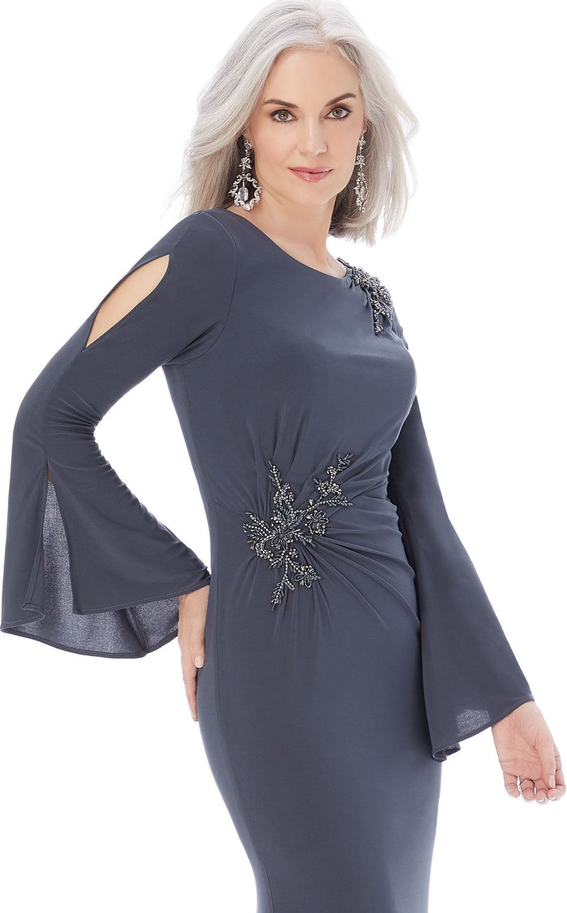 Look absolutely stunning in MGNY 72217 Dress. This delightful piece features a column silhouette and glittering accents. The long sleeve bodice has a high neckline neckline and a natural waist.
