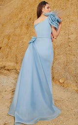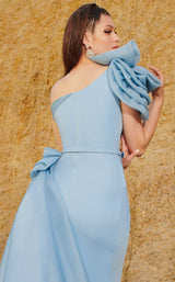 Get this evergreen drape-style dress designed by MNM Couture 2754. The dress offers a corset bodice with one shoulder neckline and ruffle sleeve. Embossed with a belt at a natural waistline the dress flares a floor length straight line pattern skirt that has a slit cut and ends with a train.