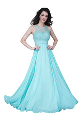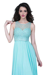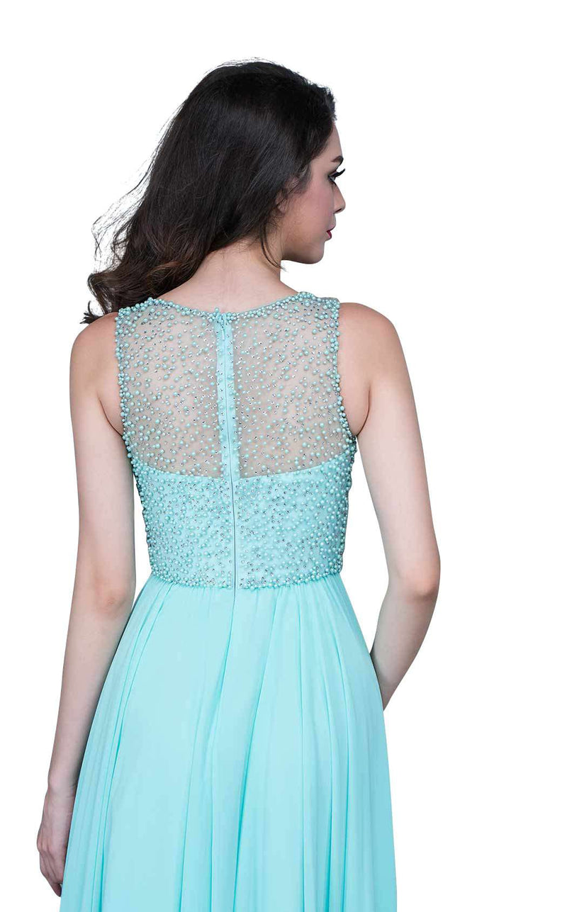 Accessorize your evening with the airy élan of this lovely formal by Nina Canacci. Shimmering beading adorns the sleeveless bodice from jewel neckline to waist. Tonal lining provides coverage at the fitted bust and midriff while diaphanous layers frame the skirt. Side gathers flare to a fluttering finish that floats like seafoam around the feet.