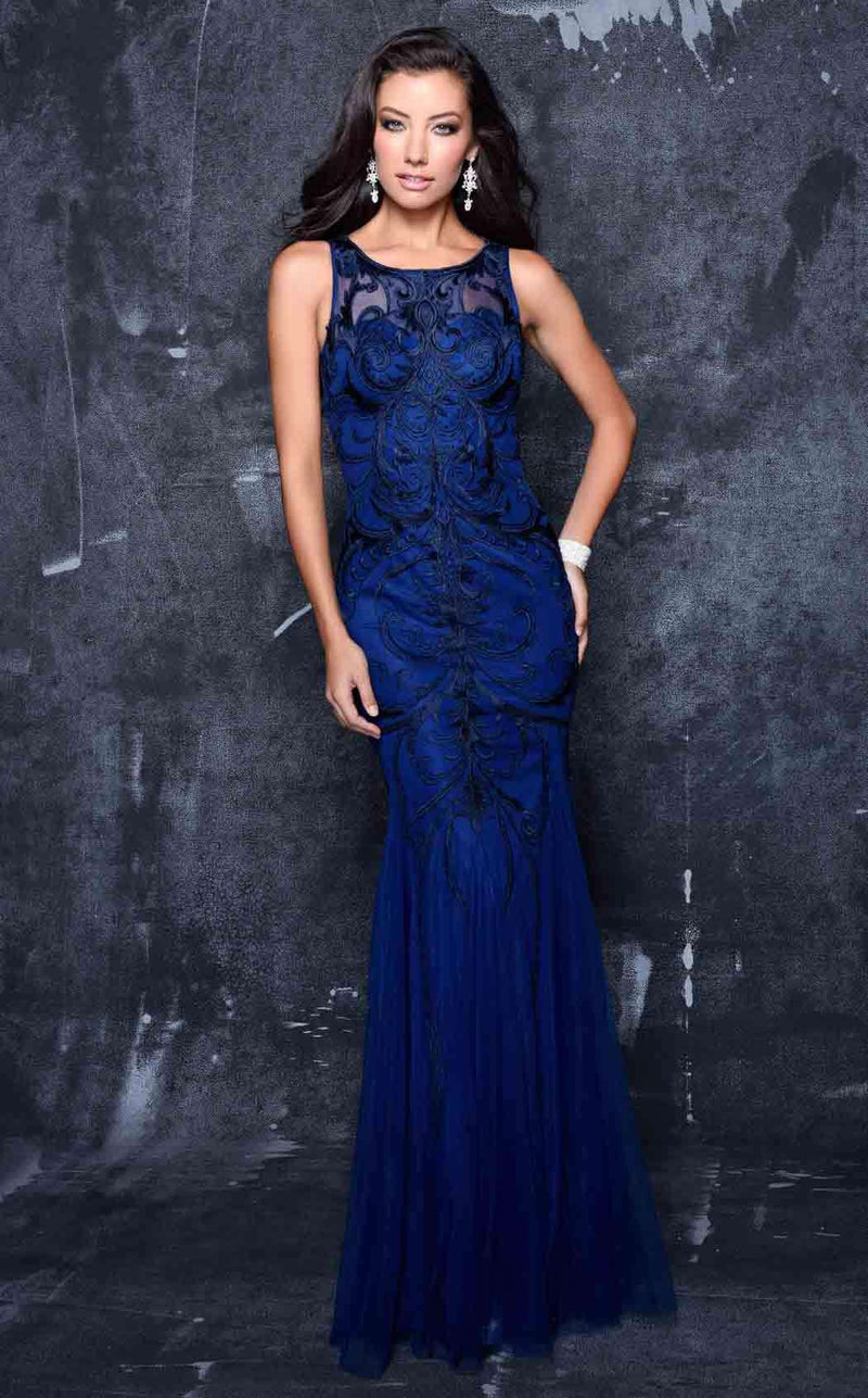 Lavish and rich, this brilliant evening dress by Nina Canacci 4134 is a beautiful choice for the red carpet. The illusion jewel neckline bodice has thin straps and features fabulous scrolling embellishments in a curve enchanting and chic pattern. Slim fitting to the low hip, this sultry ensemble slides to the full-length fishtail hem creating a fantastic tonal look.