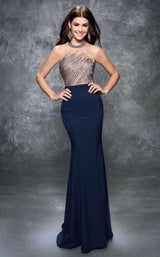 Sweet and stunning, this sophisticated evening dress from Nina Canacci 5105 is a fabulous look for any black tie occasion. The illusion halter neckline bodice twinkles with sparkling jeweled embellishments in a fantastic sketchy striped pattern creating a dreamy asymmetrical style. This opulent ensemble drapes to the full-length hem with pizzazz.