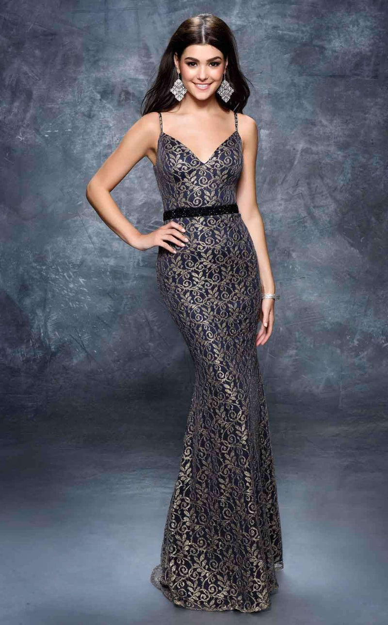 Shine bright in this eye-catching evening dress by Nina Canacci 7366. Thin spaghetti straps lead to the glamorous v-neckline bodice for a timeless and flattering style. Cinched at the waist with a chic jeweled belt, this brilliant ensemble shimmers to the full-length hem wrapped in luxurious waves of glittering gilded lace with a fresh scroll and vine pattern.