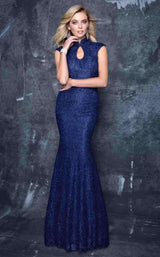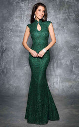 Fashionable and fabulous, this enticing evening dress from Nina Canacci 9100 is an exotic treat. The mandarin neckline bodice has glamorous cap sleeves and features a sassy keyhole cutout to show off your curves. This slim fitting ensemble is wrapped in shimmering bejeweled lace and slides to the full-length hem creating a magical and memorable black tie look.