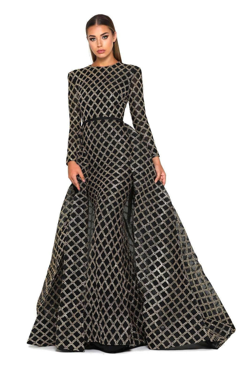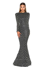Get a celebrity style in this amazing evening gown from Portia and Scarlett. The jewel neckline bodice has sharp shoulders and long sleeves creating a dazzling and dynamic look. Cinched at the waist to create curves, this astounding ensemble cascades to the full-length A-line silhouette hem in sparkling diamond patterned waves.