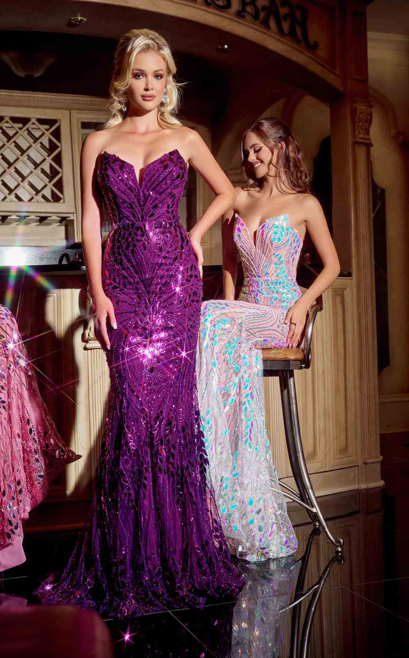 Unleash your inner diva in this princess PS24315 Portia and Scarlett dress. The strapless design features an inverted V-neckline and a mid-open zipper back. It flows through a natural waistline and ends with a mermaid skirt. Festooned with intricate beads and sequins, this dress sparkles even in dim settings. The outfit ends with a sweep train and promises a dramatic entrance.