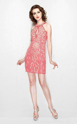 Stand out in the crowd wearing this Primavera cocktail dress. This dress has a bib-style collar with ornate sparkling detail. A keyhole detail sits at the center of the bust. Glittering sequins create rich shimmer throughout the dress. The look finishes with a mini hemline.