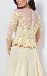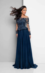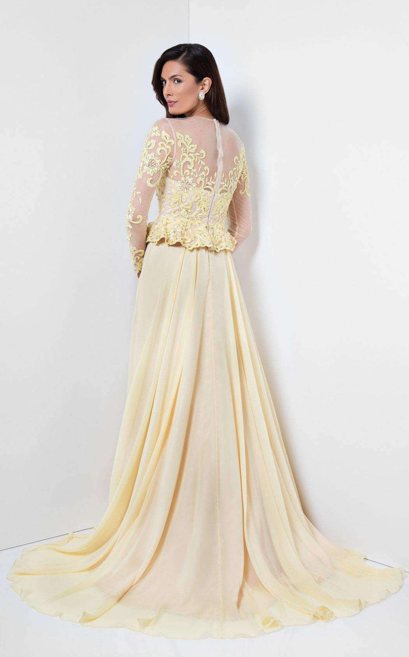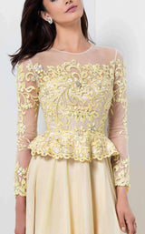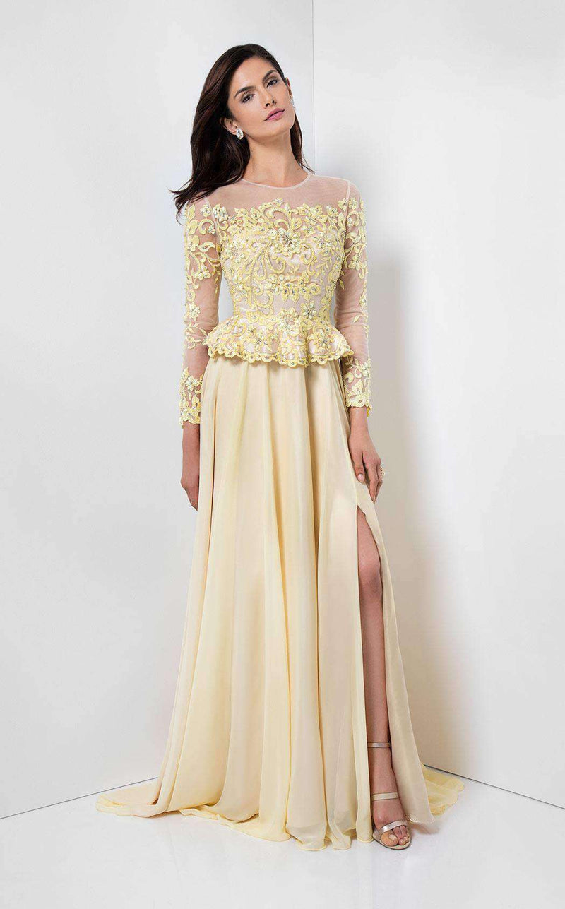 You`re ready for spring in a warm gown from Terani 1713M3477. The bateau neckline is crafted with illusion fabric that continues down the long sleeves. Textured embroidery decorates the bodice and comes into a ruffled peplum effect about your waist. The full-length skirt is shirred to reveal a side leg slit.