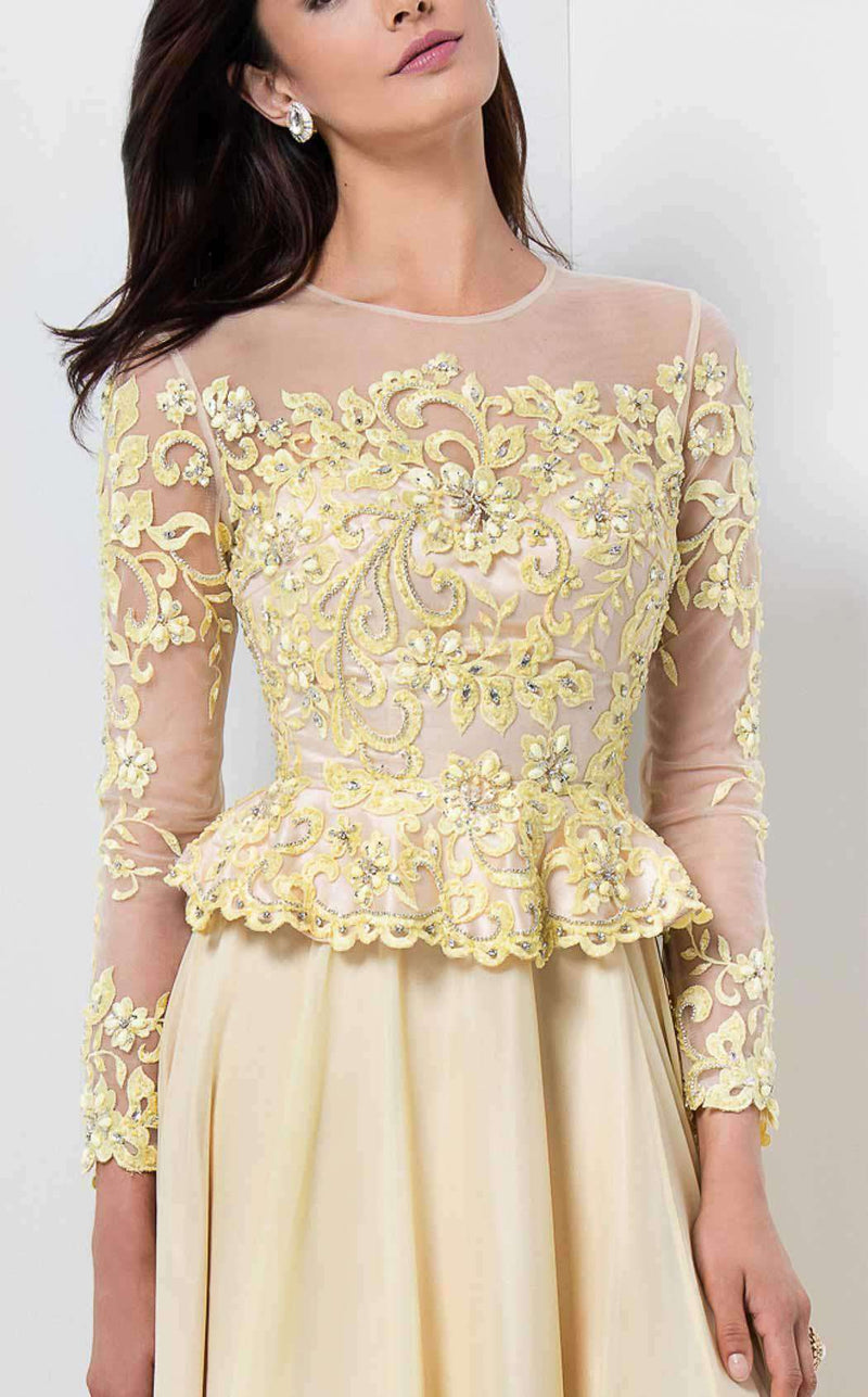 Daisy long-sleeve illusion peplum full-length gown from Terani