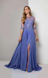 Glimmer through the seasons in a defined gown from Terani 1713M3484. Glistening sequins accent the illusion neckline and long sleeves. Crystallized embellishments form an artistic sweetheart bodice. The A-line skirt is shirred with lush fabric to flare about your legs and end in a full-length hemline that features a high side leg slit.