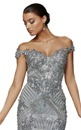 Dress to the nines in this luxe short formal by Terani. Leafy appliques trim the chic, off-the-shoulder neckline with fresh detail. A bodycon fit fashions a curvy silhouette from the bust through the hips, and a banded hemline completes the short, straight skirt. Shimmering lines surround you with stunning sparkle.